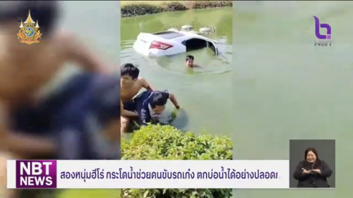 สองหนุ่มฮีโร่ กระโดดน้ำช่วยคนขับรถเก๋ง ตกบ่อน้ำได้อย่างปลอดภัย